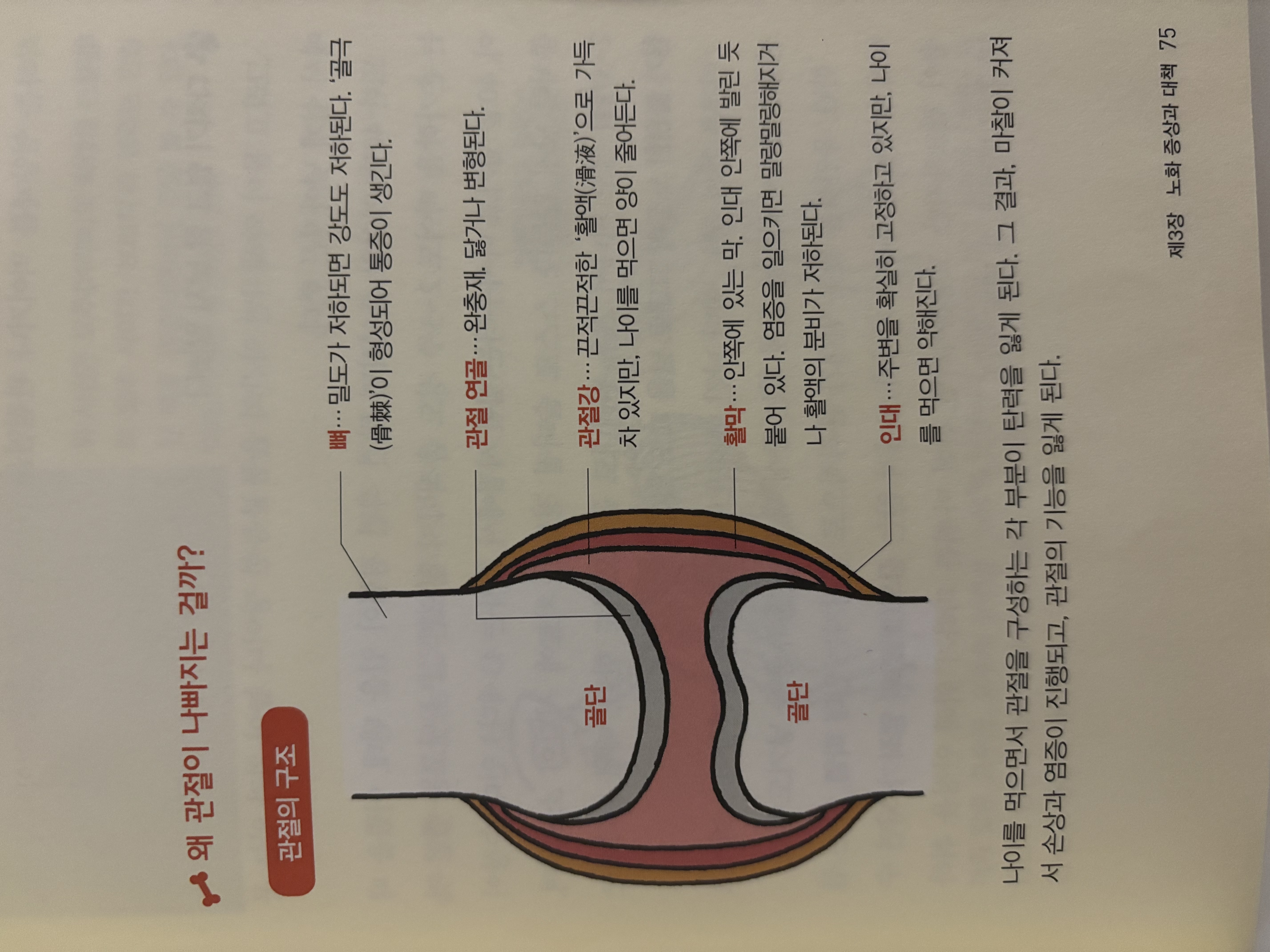 - 관절의 접합부 부근의 뼈의 모서리가 돌출하게 되어 구부리거나 필 때 통증을 느끼게 된다거나(퇴행성 관절염), 등뼈의 경우에는 그것이 이어져서 움직이지 못하게 된다. 그래서 일어서기나 앉기 등 일상적인 동작을 하기 어려워지는 것이다.