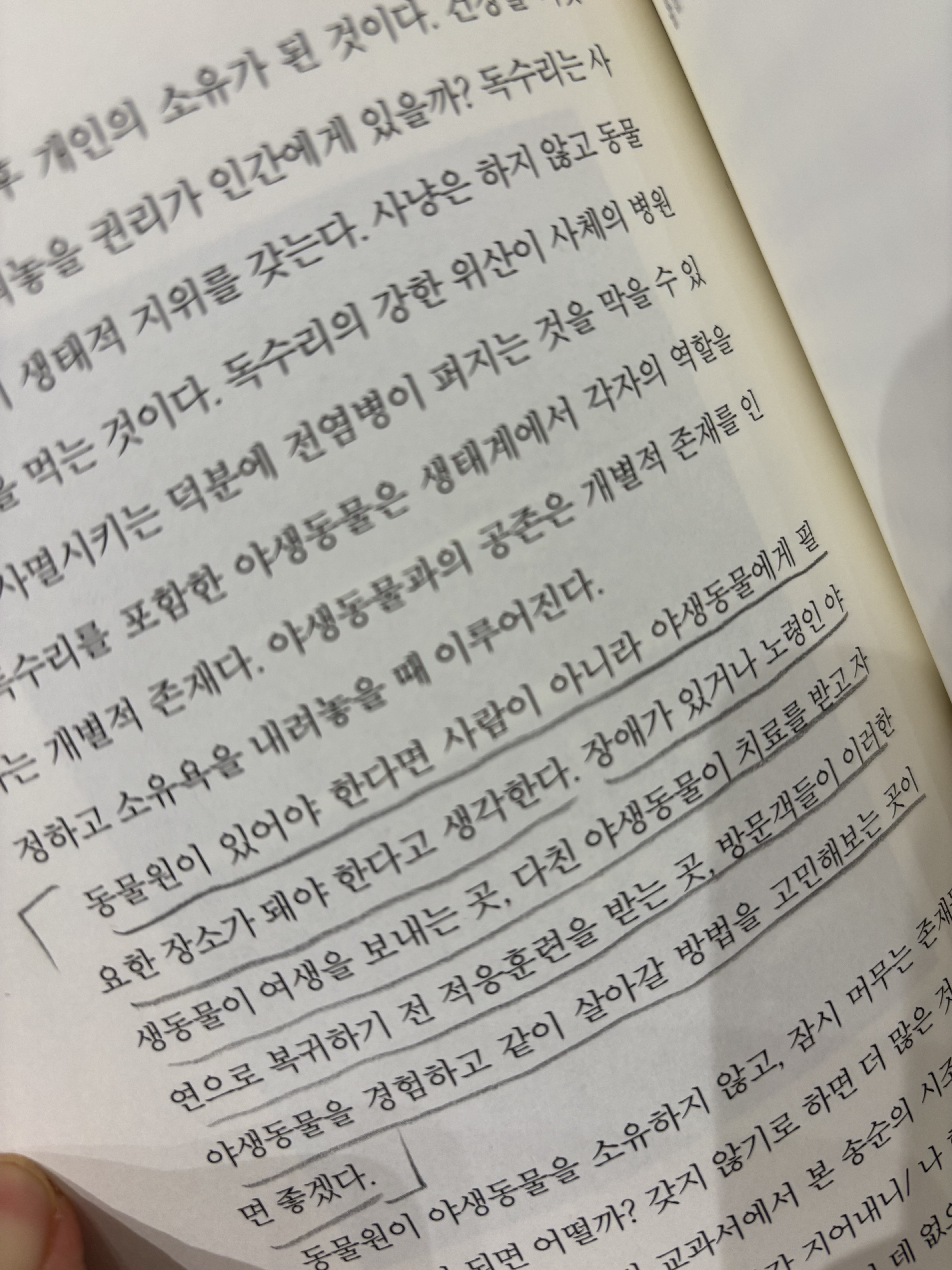 "자기만의 일상을 오롯이 누릴 수 있을 때 동물들은 비로소 평온하다. 동물을 돌보는 일은 동물들이 평범한 하루를 보낼 수 있게 해주는 것이다. 돌본다는 것은 개체별 특성을 이해하고 필요한 것을 해주며 끝까지 책임지는 일이다. 좋아하는 마음만으로는 부족하다. 많은 애를 써야 하고, 기쁨은 잠깐이며, 오래 슬프고 종종 그립다."